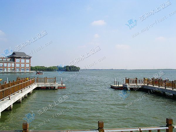 张家港市暨阳湖欢乐世界园区浮桥搭配了钢板塑木板及栏杆主装而成